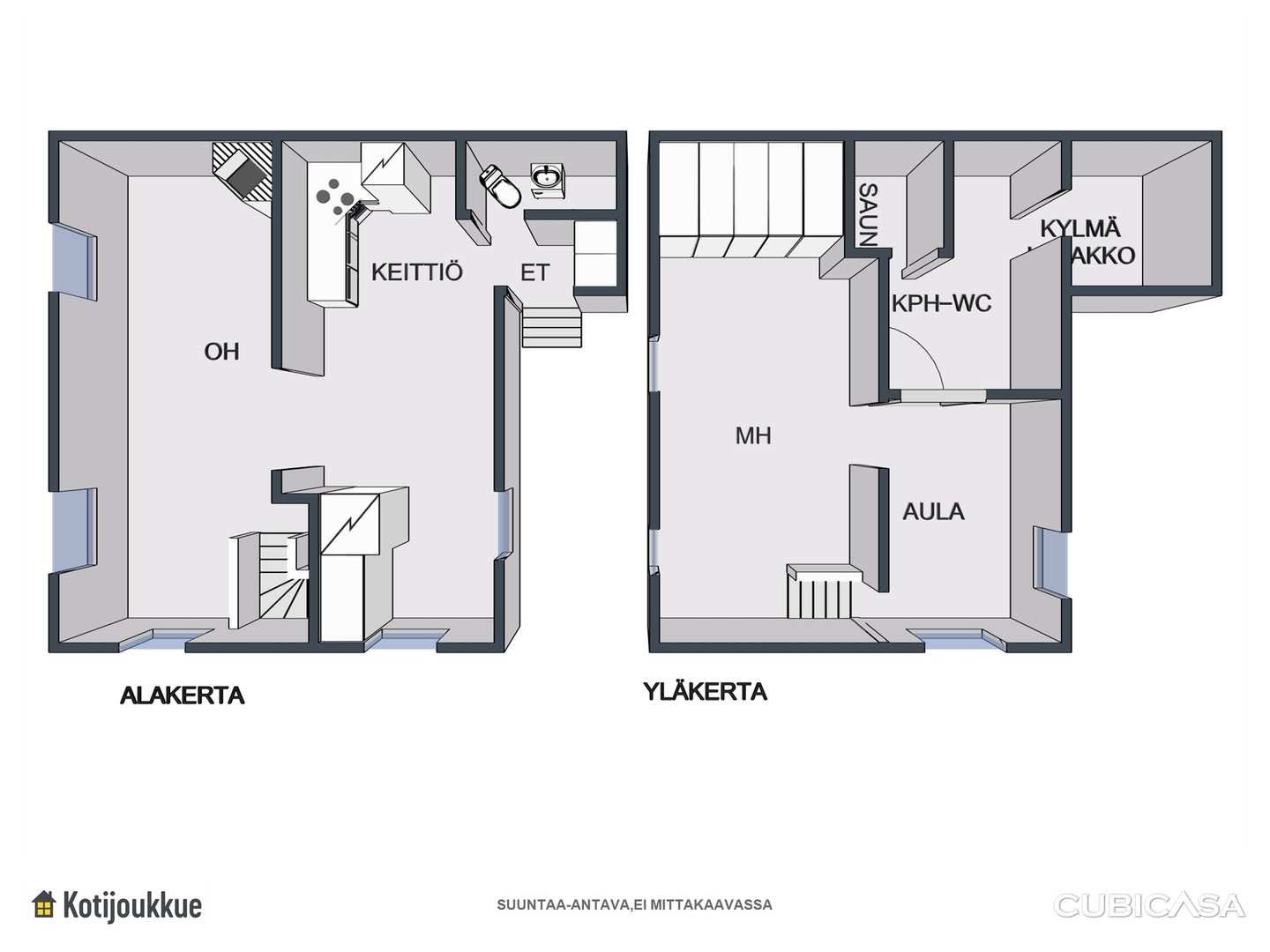| Kylpyhuoneen varusteet | WC-istuin, suihkuseinä, pesukoneliitäntä ja lattialämmitys |