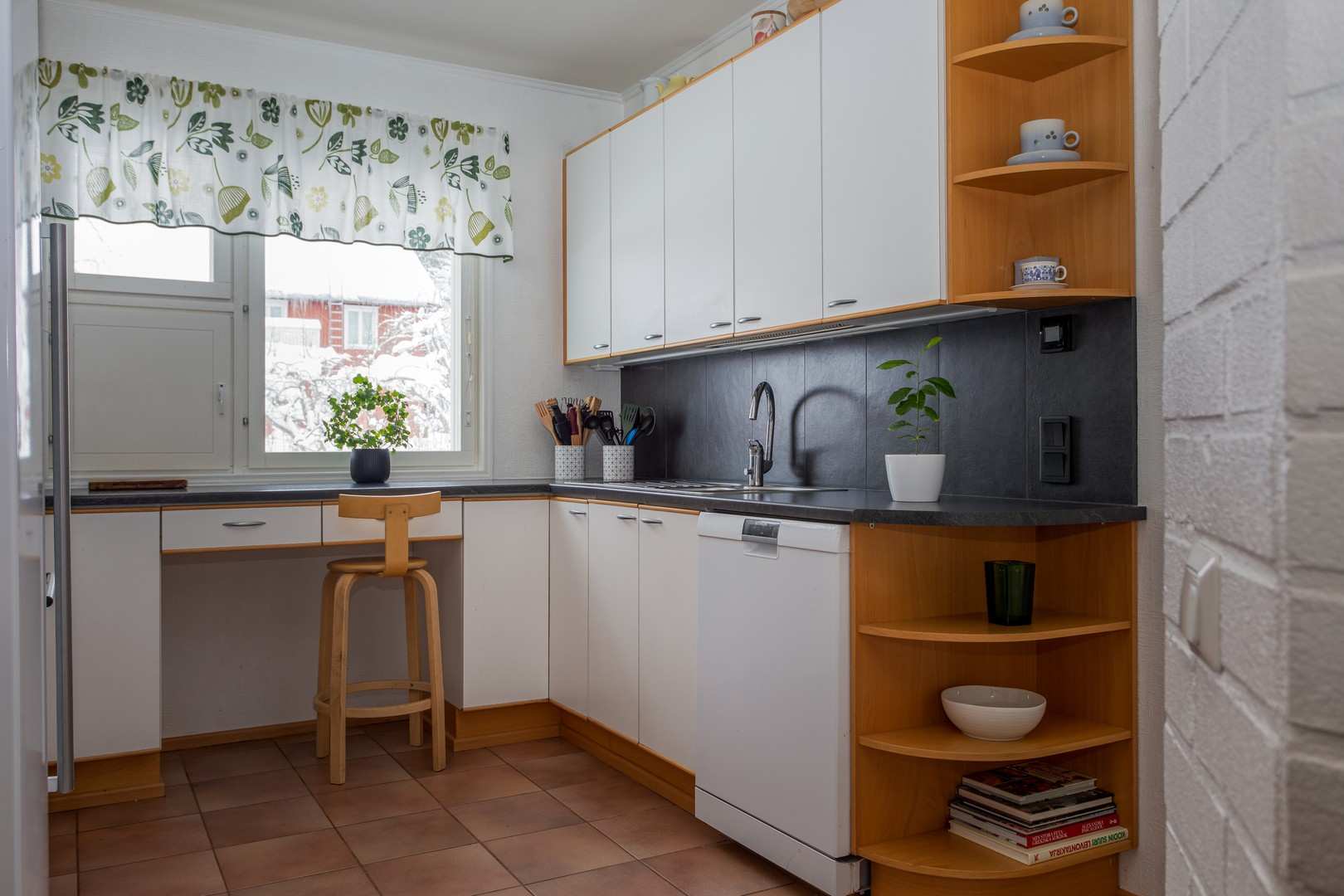 | Keittiön materiaalit | Lattia: Laatta Seinät: Maali ja tapetti |