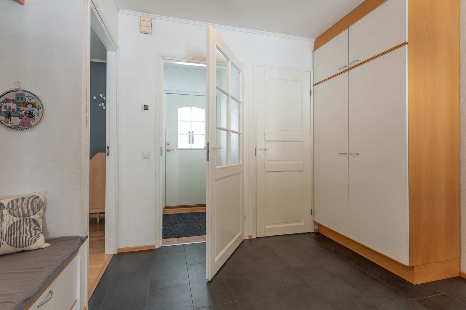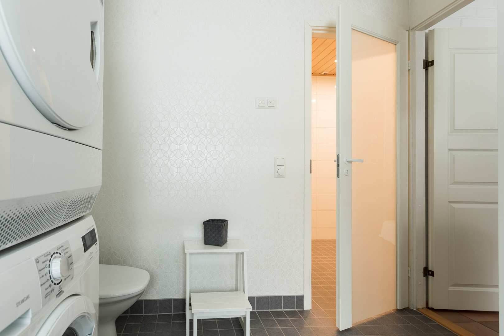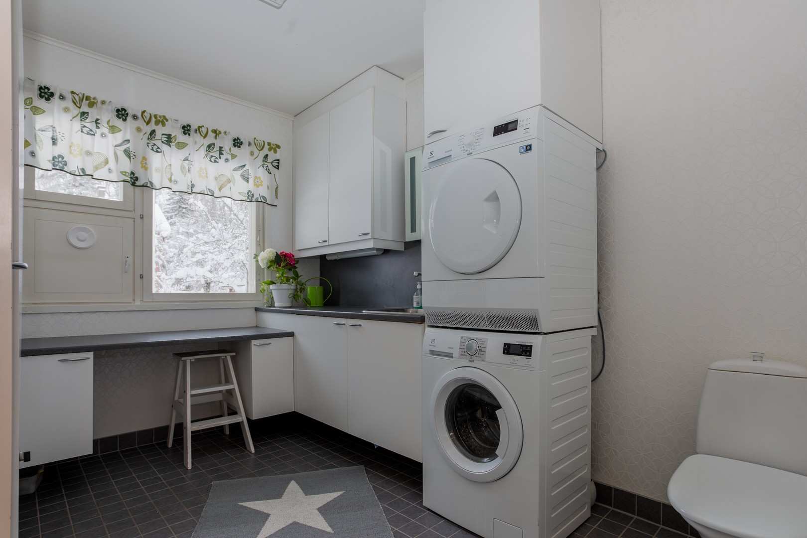 | Kodinhoitohuoneen materiaalit | Lattia: Laatta ja wc-istuin Seinät: Tapetti |