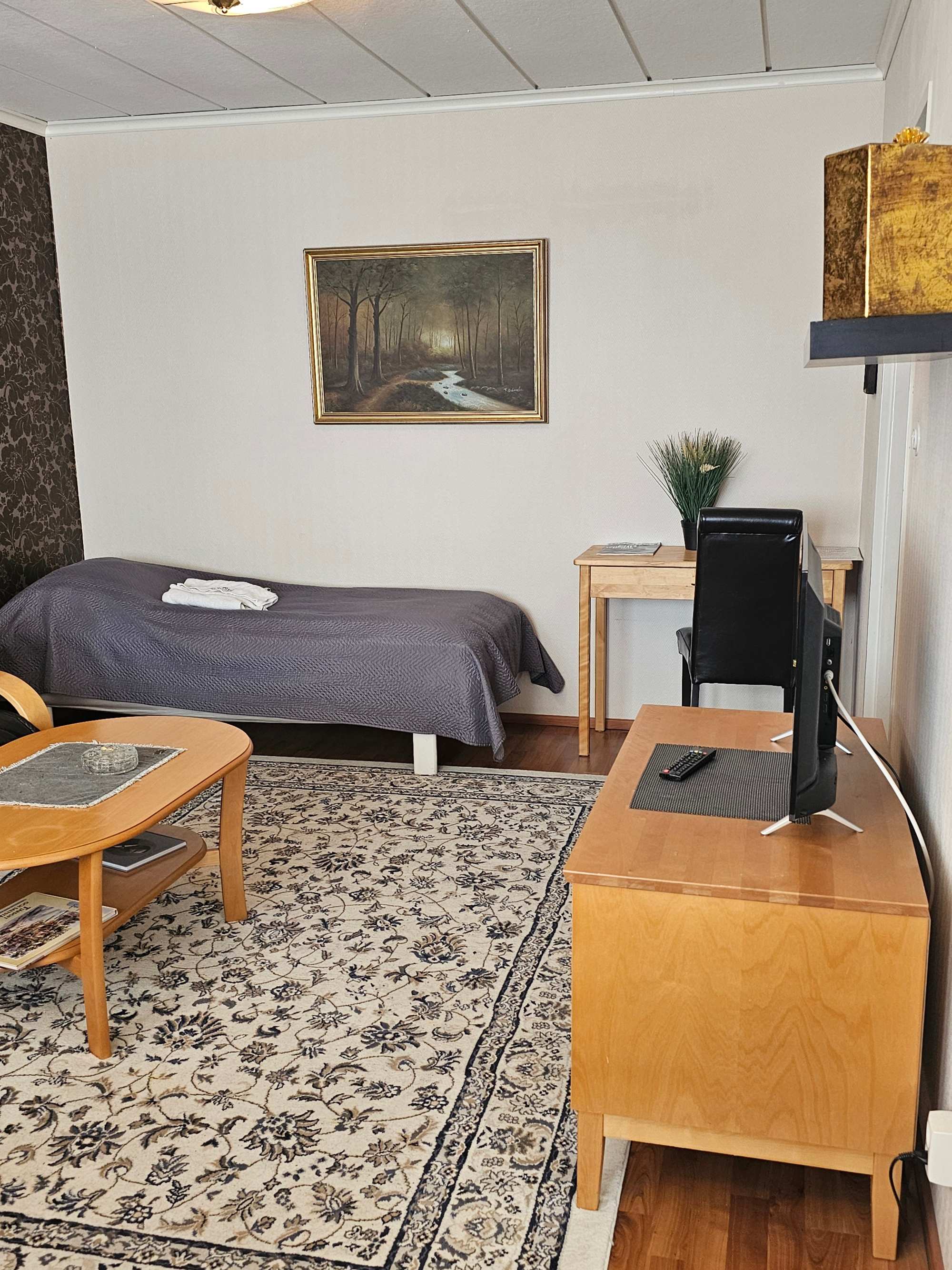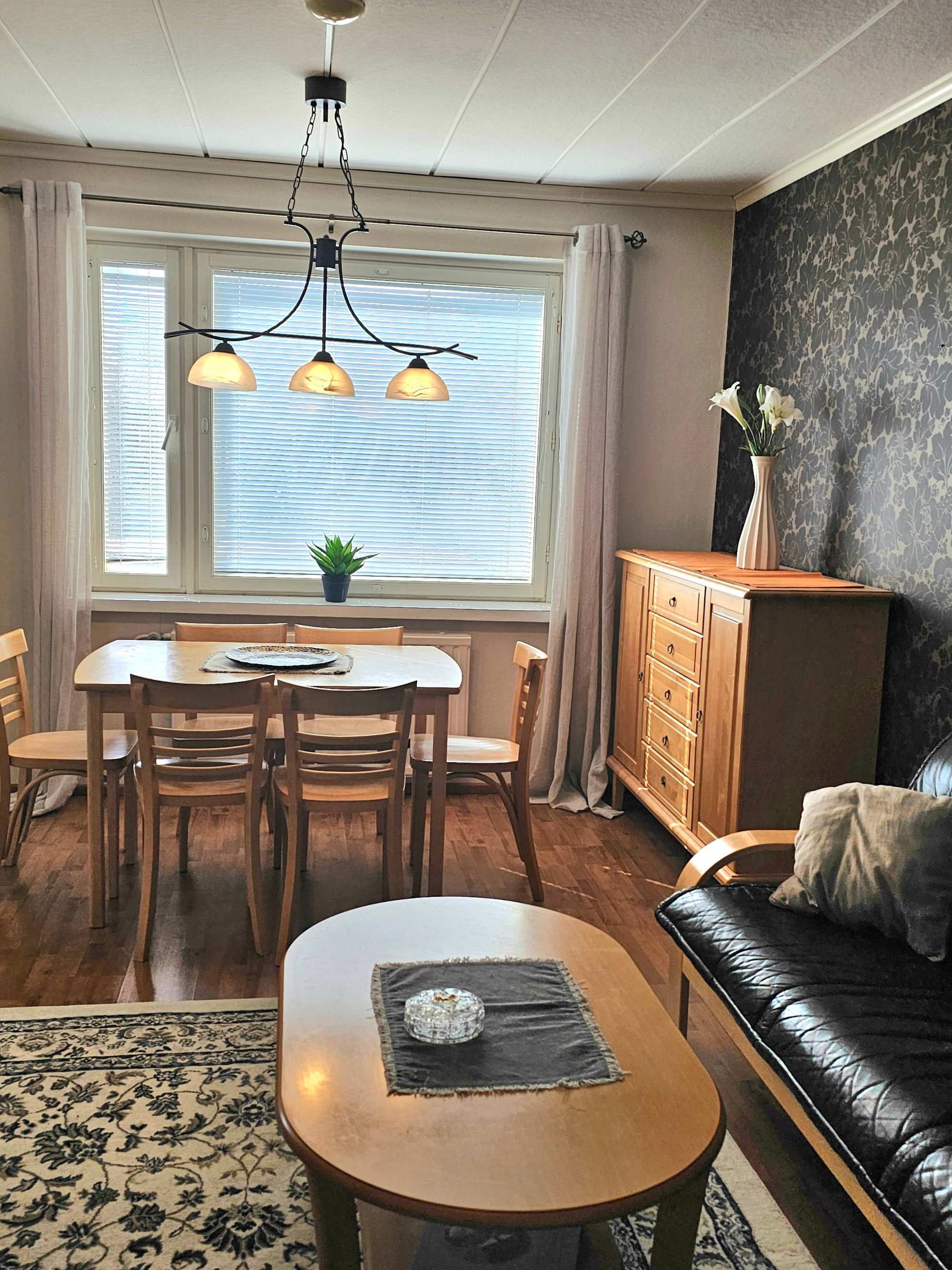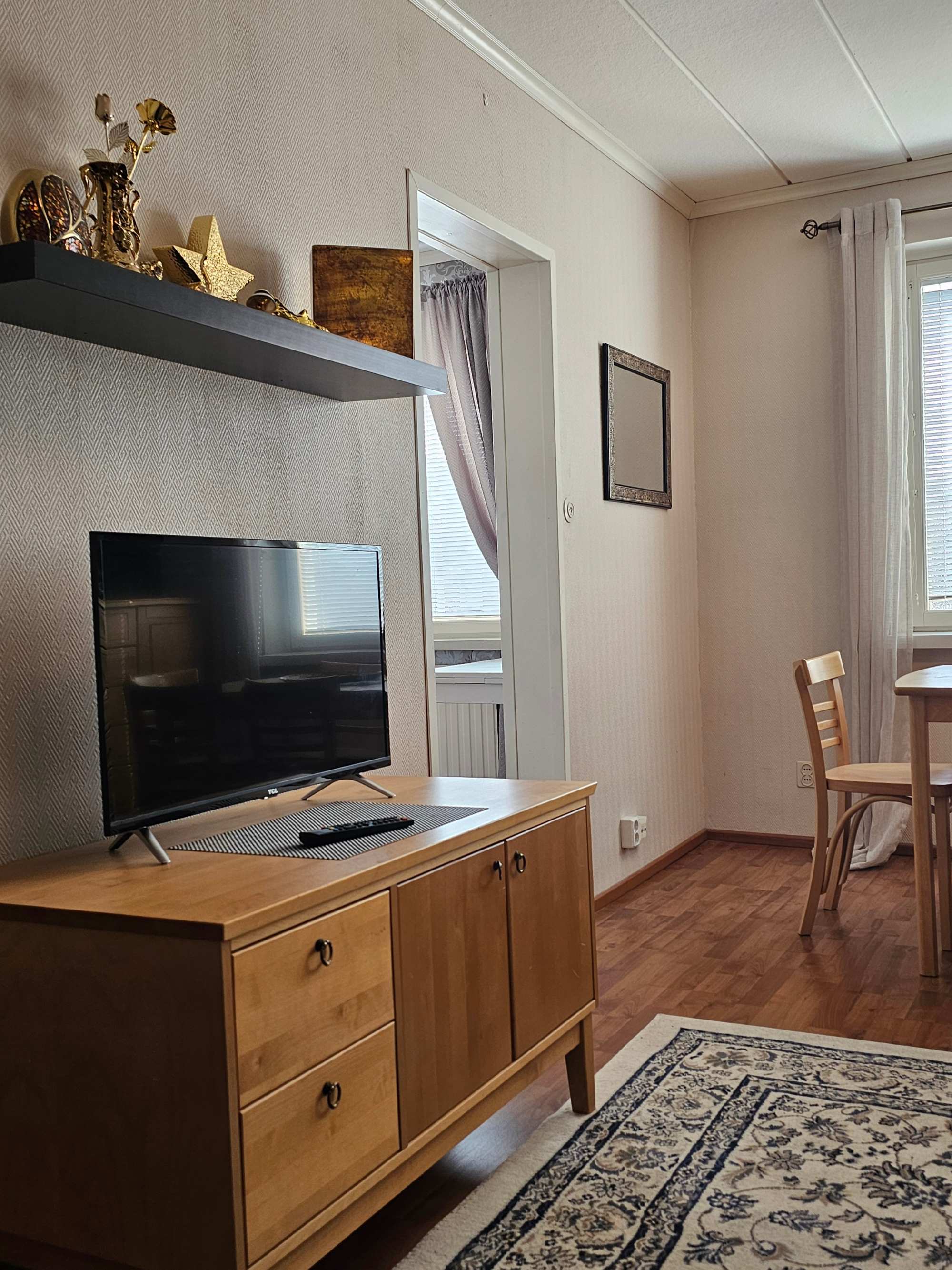 | Olohuoneen materiaalit | Lattia: Laminaatti Seinät: Maali ja tapetti |