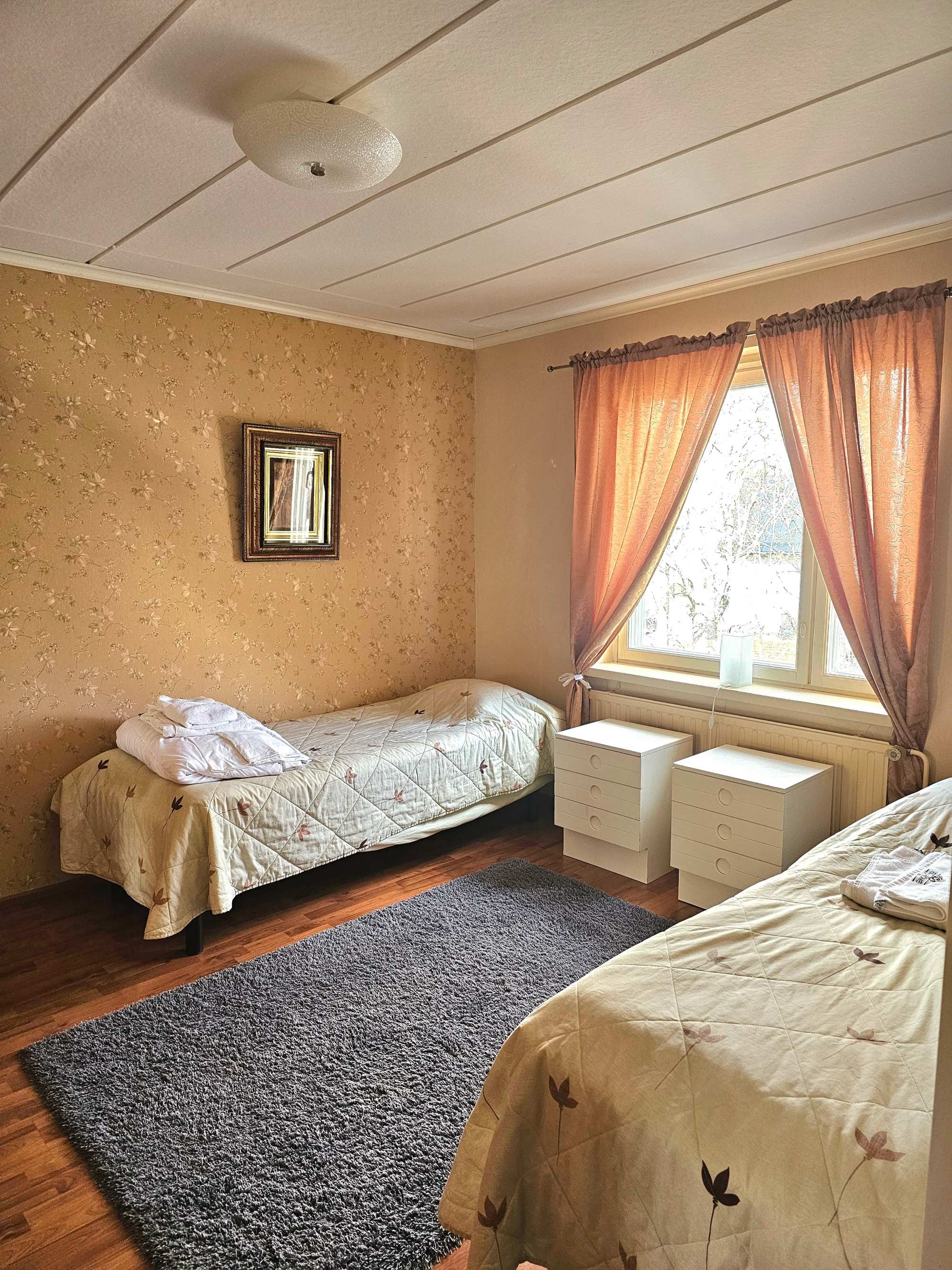 | Makuuhuoneen materiaalit | Lattia: Laminaatti Seinät: Maali ja tapetti |