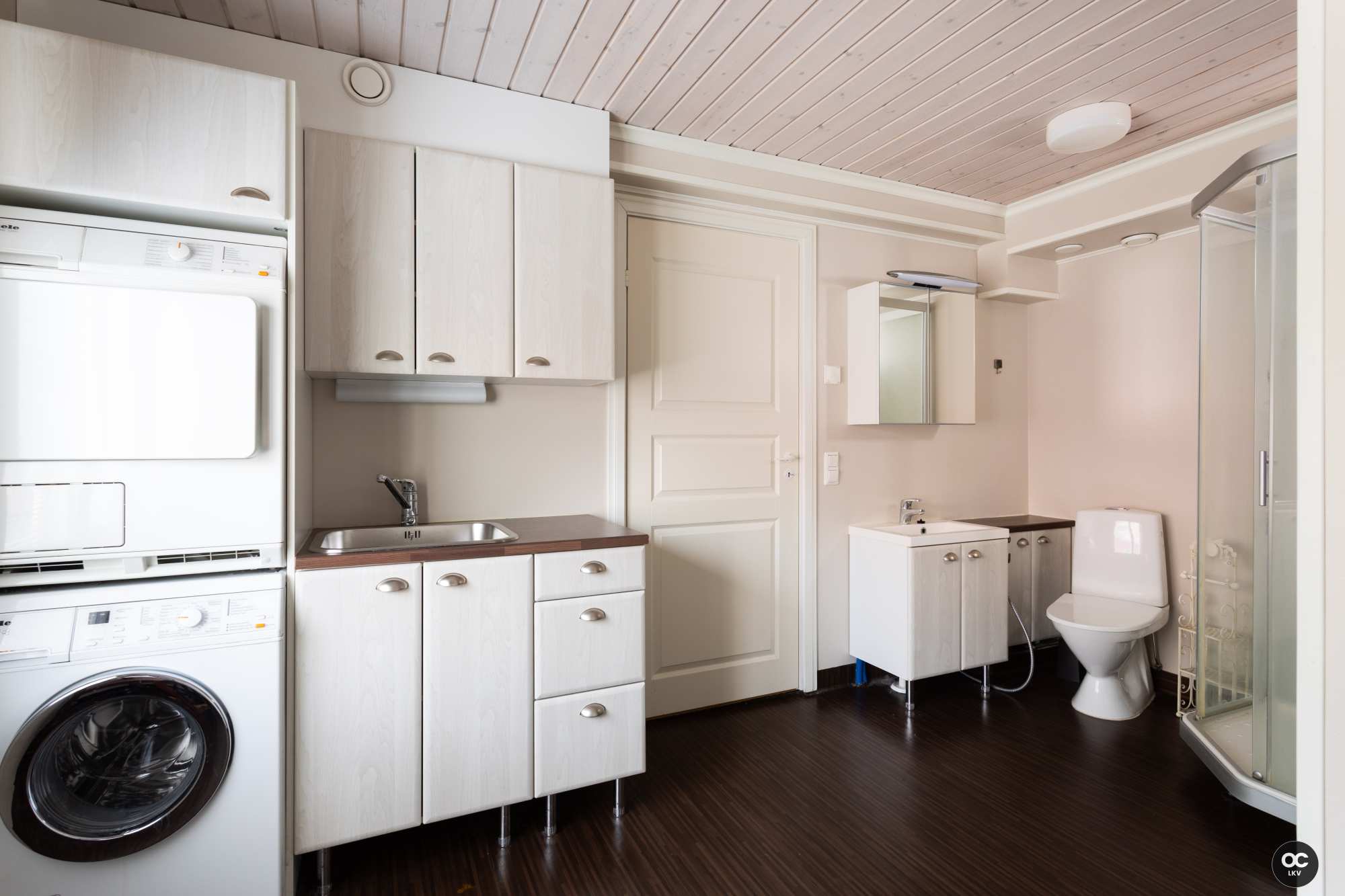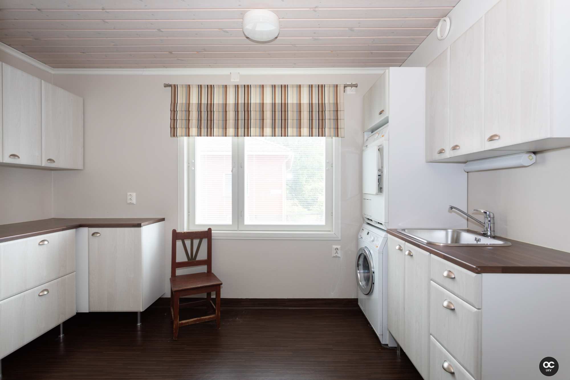 | Kodinhoitohuoneen varusteet | Pesukoneliitäntä, pyykkikaapit, pöytätaso, pesuallas ja tila pesutornille |