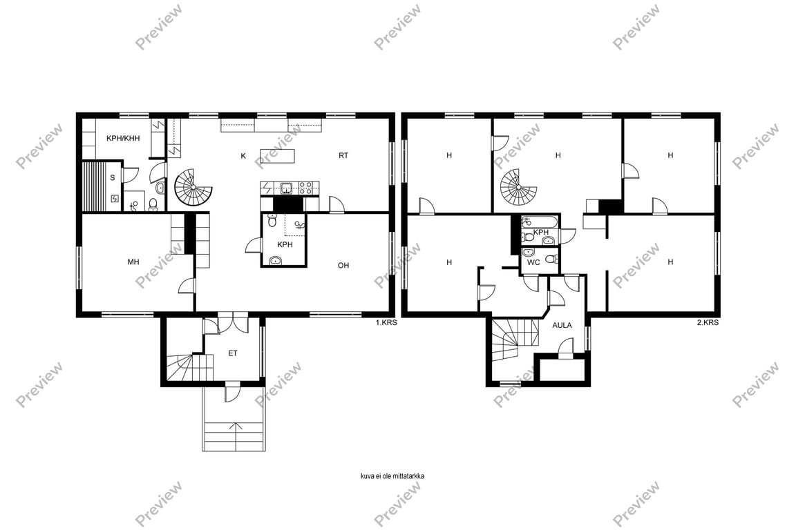 | Tehdyt korjaukset ja remontit | Yläkerta remontoitu 1994. Ensimmäisen kerroksen täysi remontti v. 2010 silloin kaukolämpö asennettiin. Lattiat revittiin kokonaan pois ja uusittiin, uudet koolaukset ja eristeet, vesikiertoinen lattialämmitys asennettiin, sisäseinät poistettiin kokonaan ja uusittiin, uudet eristeet, sisäkatto uusittiin (puupaneeli) Koneellinen ilmanvaihtojärjestelmä asennettiin alakertaan, uusi sauna ja kodinhoitohuone, kaikki sähköt ja vesiputket uusittiin. Ikkunat vaihdettiin v. 2013 17 kpl molemmissa kerroksissa, kuistin ikkunoita ei vaihdettu. Toisen kerroksen pintaremontti v. 2020 Teehuone, työhuone ja makuuhuone sai uudet tapetit, makuuhuone myös laminaattilattian. Toisen kerroksen WC:n pytyt ja kalusteet uusittiin v. 2020. Vesikatto maalattiin v.2022 ja talon ulkomaalaus v. 2023. Talon piirustukset uudistettu v. 2025 ja muutettu pienkerrostalosta omakotitaloksi. Ilmanvaihto tarkistettu/testattu ja vesijärjestelmä testattu 2025. |