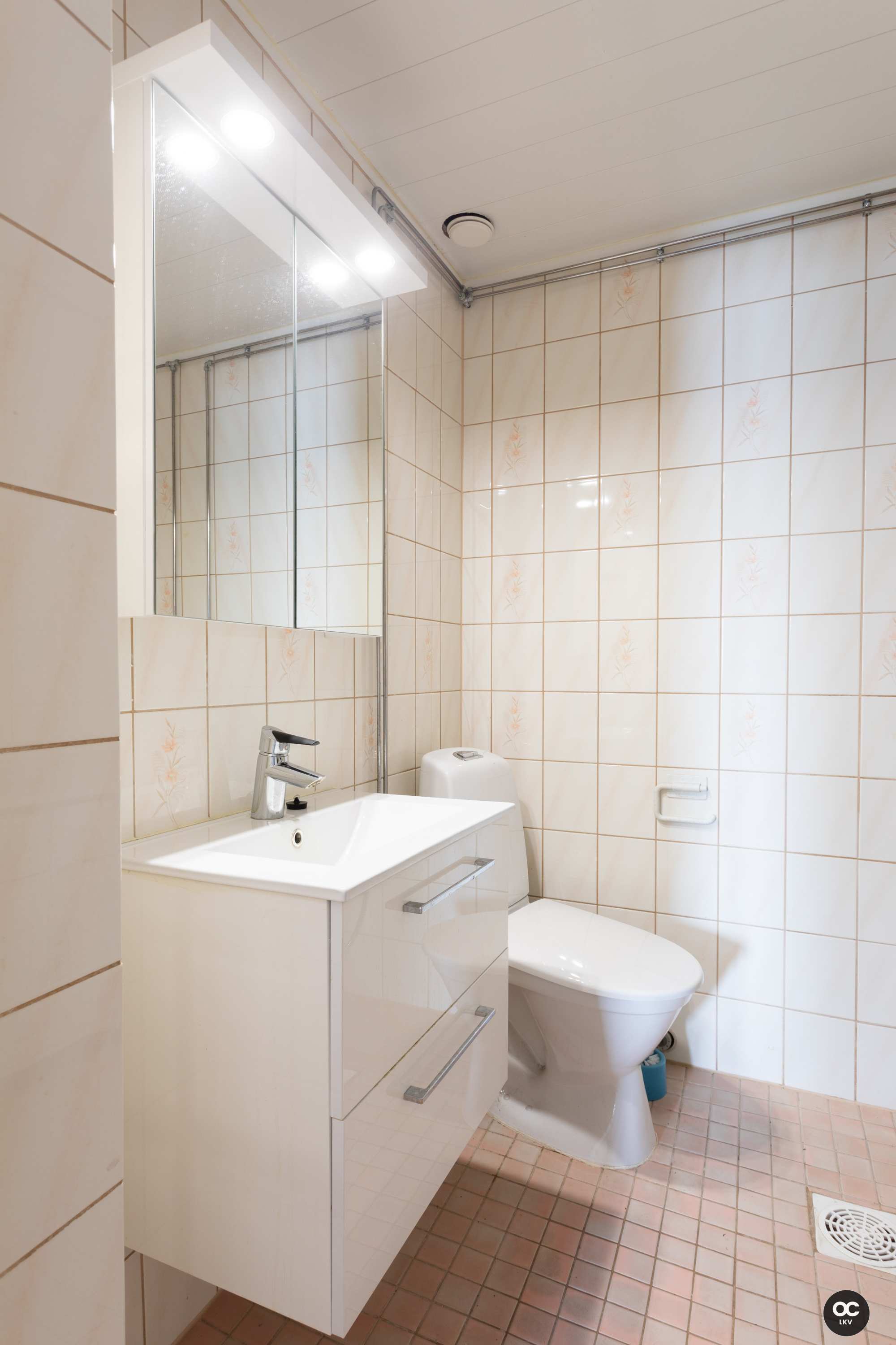 | Kylpyhuoneen varusteet | Lattialämmitys, wc-istuin, pesukoneliitäntä, suihkukaappi, peilikaappi, pesuallas, allaskaappi ja bidee-suihku |