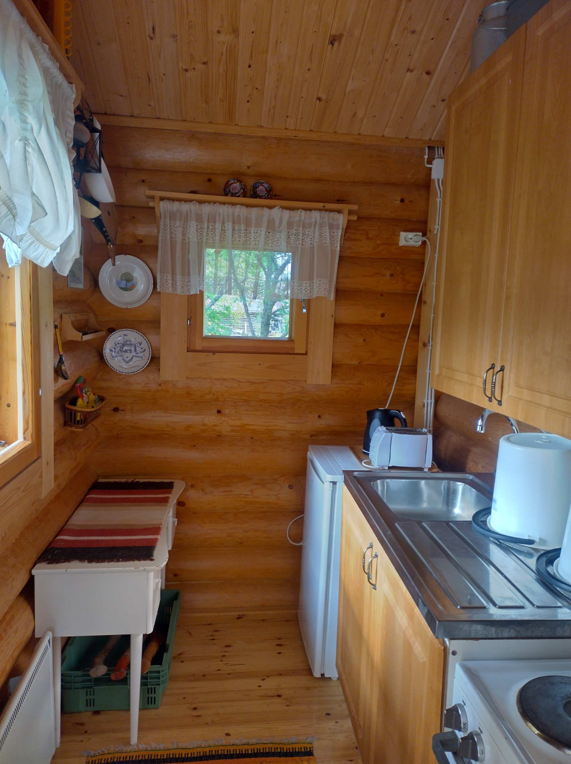 | Keittiön materiaalit | Lattia: Lauta Seinät: Hirsi |
